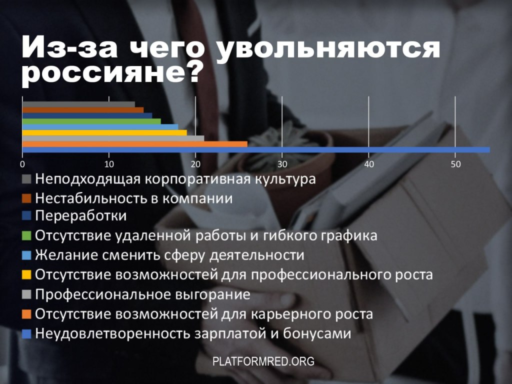 Неудивительно, что на этом фоне об отсутствие возможностей для профессионального роста и выгорании заявило 26% и 21% соответственно. Эта тенденция демонстрирует отчуждение рабочего от результатов своего труда, что и приводит к выгоранию на рабочем месте