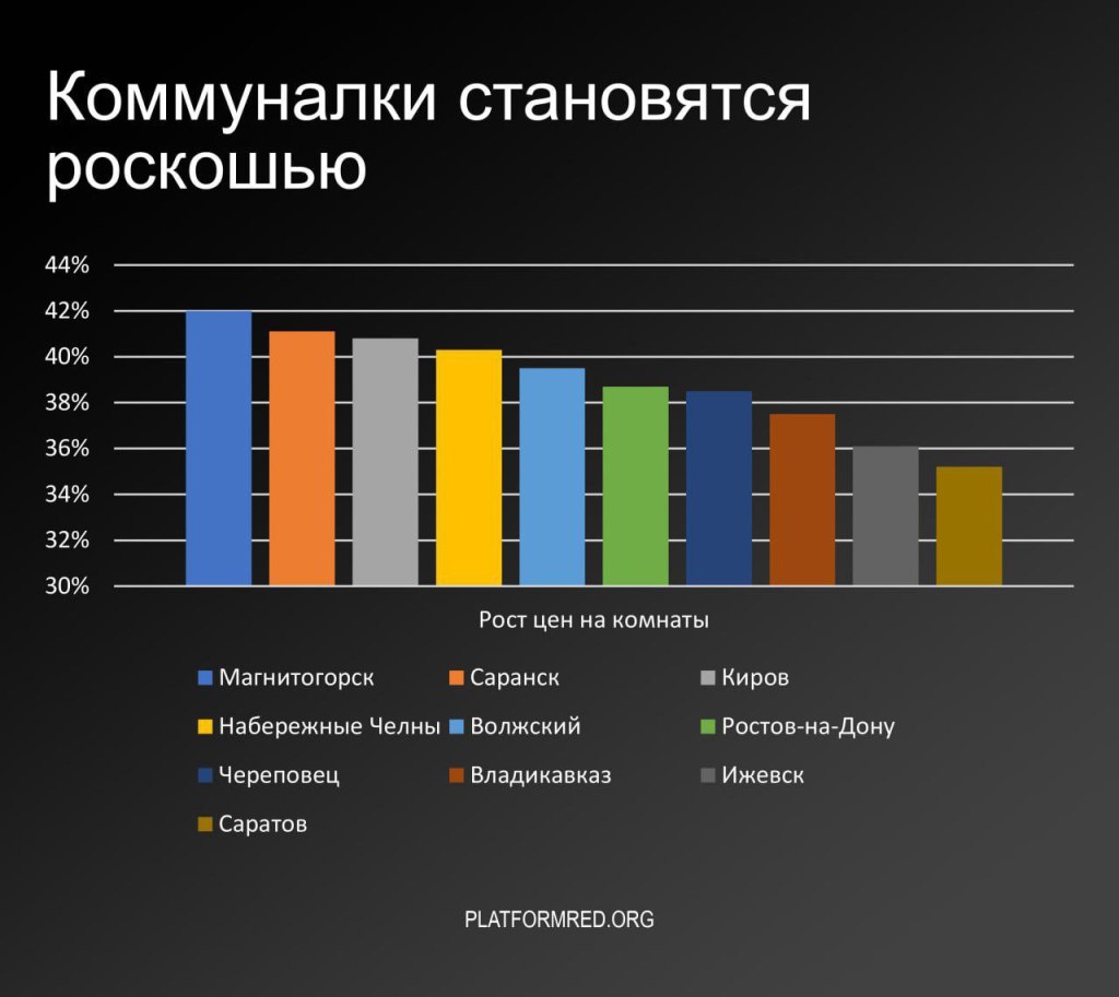 Темпы роста цен на коммуналки в российских городах обгоняют рост цен на квартиры. Цифры, как всегда, кричат о классовом неравенстве: за год цены на коммунальные комнаты взлетели на 15,4%. В Магнитогорске, Саранске, Кирове — везде, где заводы и фабрики десятилетиями кормят олигархов, комнаты подорожали на 40%