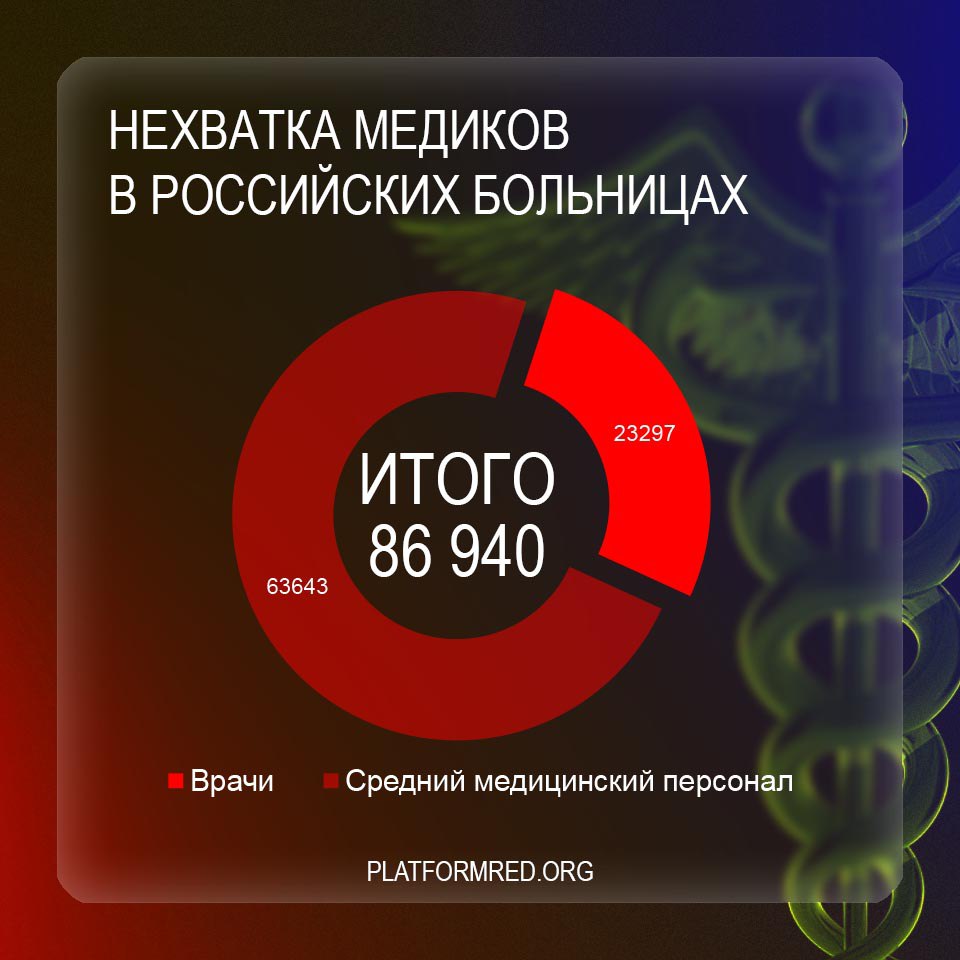 Министерство здравоохранения заявило, что нехватка врачей в России превысила 23 тысячи человек. С учётом нехватки среднего медицинского персонала в 63 тысячи человек, общий дефицит квалифицированных кадров в российских больницах приближается к 90 тысячам человек.